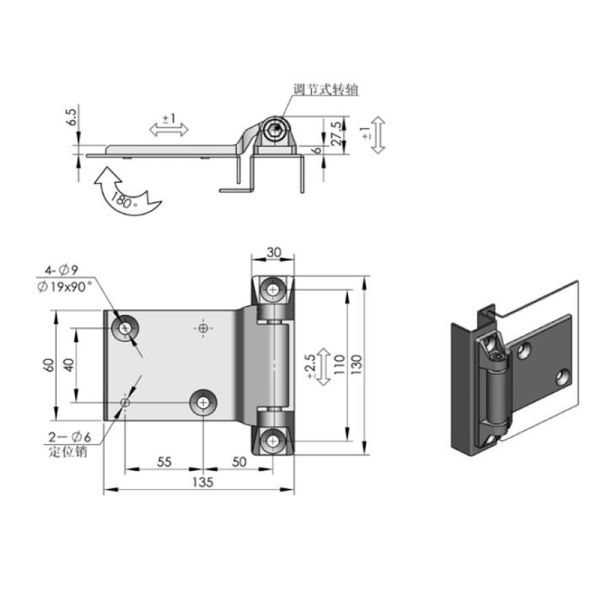 Adjustable Cabinet T Type Hinge in industrial hinge feature:China Adjustable Cabinet T Type Hinges.Material: Zinc Alloy (ZDC) ,Finish: Sand Black.Need to trepan holes for dowel pins when trepanning.Adjustable Cabinet T Type Hinge in metal hinge advantage:Shaft can be adjusted.Two holes assembling, two holes positioning, easy to operate.Left and right two types can be chosen.Industrial hinge or metal hinge application:Large-scale chassis; Testing box; Oven, etc.